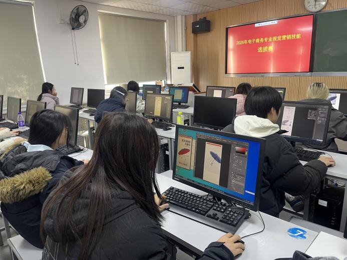 为进一步提升学生职业技能水平,2026年1月9日,电子商务专业在创业园B401成功举办学生技能运动会电子商务“视觉营销”专项赛。本赛项对接电子商务行业“视觉营销”岗位需求,紧密贴合行业发展新趋势,全方位检验学生解决实际商业问题的能力。在视觉营销竞赛中,选手完成从市场洞察、商品分析到营销策略制定的全流程设计,完整模拟电子商务视觉营销相关岗位综合技能。在核心的商品详情页设计环节,选手们融合使用Photoshop、AI等相关工具,既体现了岗位技能基本功底,又充分挖掘人工智能对营销优化的能力。部分选手的优秀作品不仅以作图精良,更深入融入用户心理分析,创作出兼具吸引力与商业价值的产品详情页。