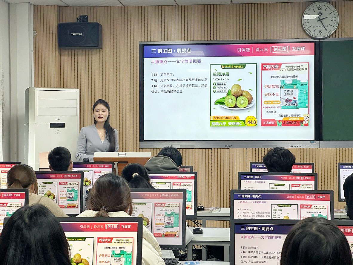 为深化电子商务专业教学改革,推动 AI 技术与职业教育深度融合,11 月 17 日,创业学院叶露露老师在创业园A401教室开设《主图营销设计——电商架桥 农货出山》公开课。学校教学督导、学院教学督导及部分教师现场参与观摩指导。
