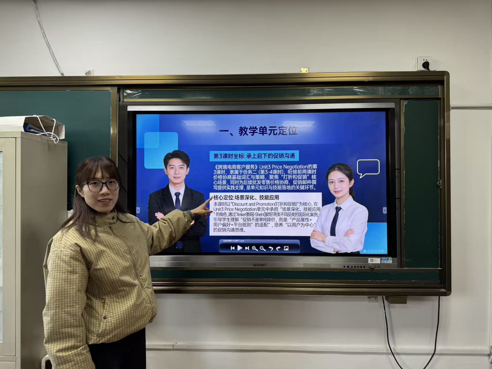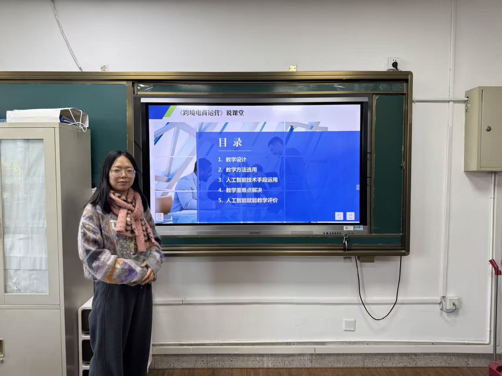 本次“说课堂”活动由跨境电商教研室组织实施,参赛教师立足真实课堂情境,围绕教学目标设定、教学流程设计、教学方法运用及人工智能技术融入等方面进行系统阐述。陈俏丽老师以《跨境电商运营》课堂教学为展示内容,结合跨境电商平台运营实际,重点介绍了课堂中任务驱动与数据分析相结合的教学设计思路,并通过引入 AI 工具辅助运营分析与决策,引导学生在实践中理解运营逻辑,提升课堂参与度与学习实效。