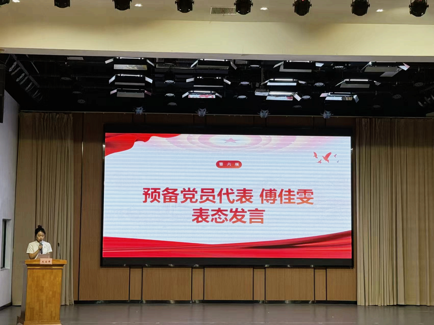 随后,在场的老师为新发展的预备党员佩戴了党员徽章,并向他们发放《中国共产党章程》。新预备党员面向党旗,进行了集中入党宣誓。一声声坚定有力、庄严响亮的宣誓声,充分表达了他们为共产主义奋斗终身的坚定信心和决心。