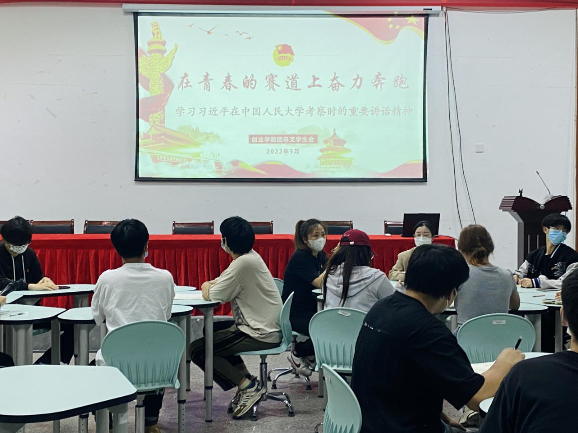 五四青年节到来之际,习近平总书记在中国人民大学考察调研并发表重要讲话,对高校师生和广大青年提出殷切期望。创业学院团总支第一时间安排,组织大学生青年以书记领学、党员带学、集中研学、线上广学、实践检学等多种形式深入学习领会习近平总书记的重要讲话精神。