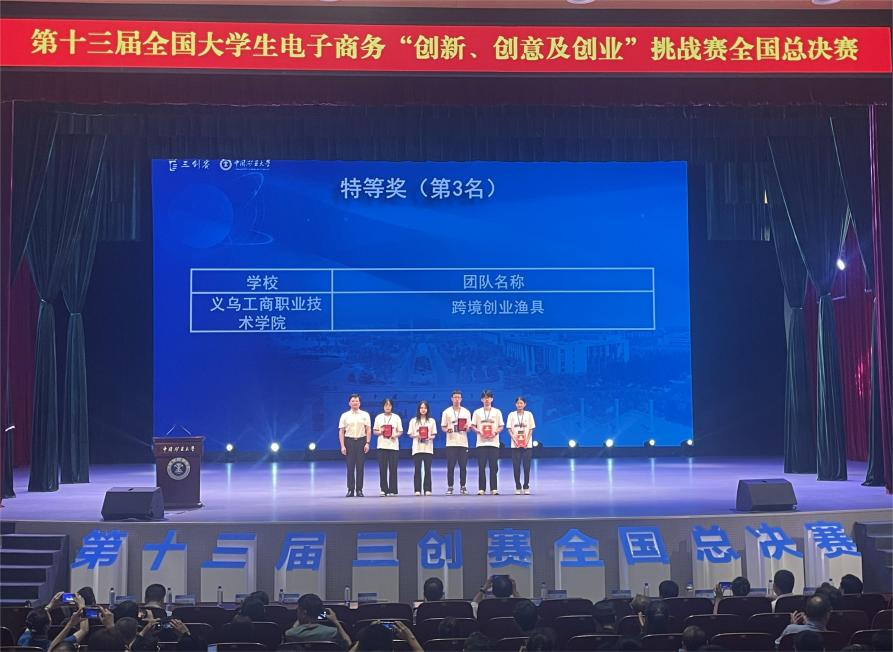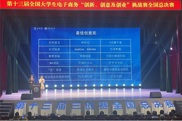 8月1日至2日,第十三届全国大学生电子商务“创新、创意及创业”挑战赛(以下简称“三创赛”)常规赛全国总决赛在中国矿业大学圆满举行。我校李春丽、金航飞老师指导的“跨境创业渔具”团队《渔来渔往》项目荣获特等奖,位列全国第三名。团队还荣获最佳创新奖、最佳创意奖、最佳创业奖,两位老师荣获最佳指导老师。