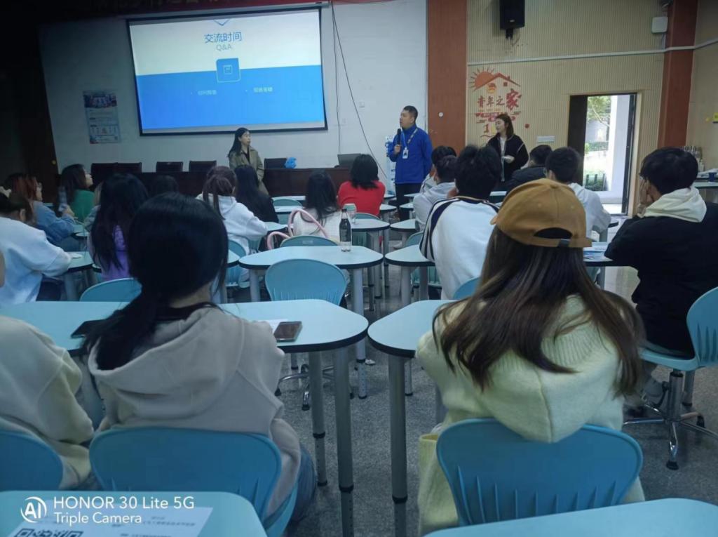 此外,在宣讲会现场还进行了互动环节,学生们就自己关心的问题向聚水潭企业的招聘负责人提问。招聘负责人耐心回答了学生的问题,并分享了自己在职业发展中的经验和建议。