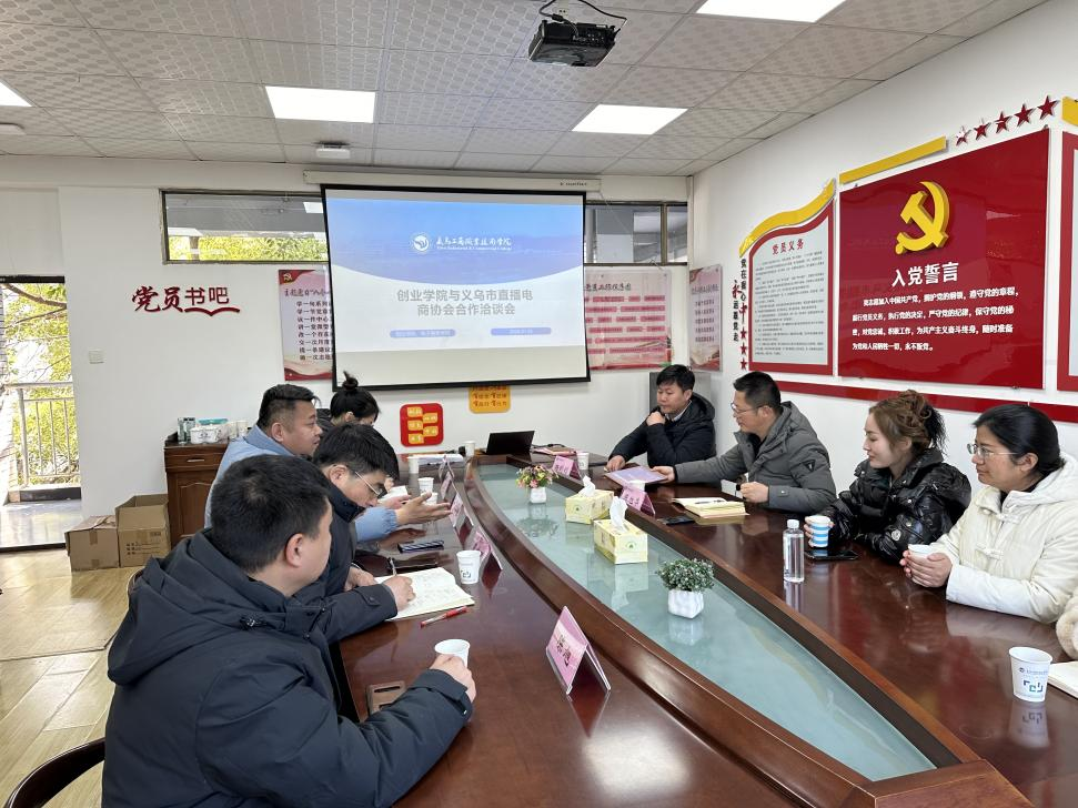 2024年1月23日下午,创业学院与义乌市直播电商协会成功召开校协合作洽谈会,义乌市直播电商协会会长陈文军、秘书长詹兆理等5人,创业学院院长陈旭华、副院长杨剑钊以及直播电商教研室老师们参加会议。