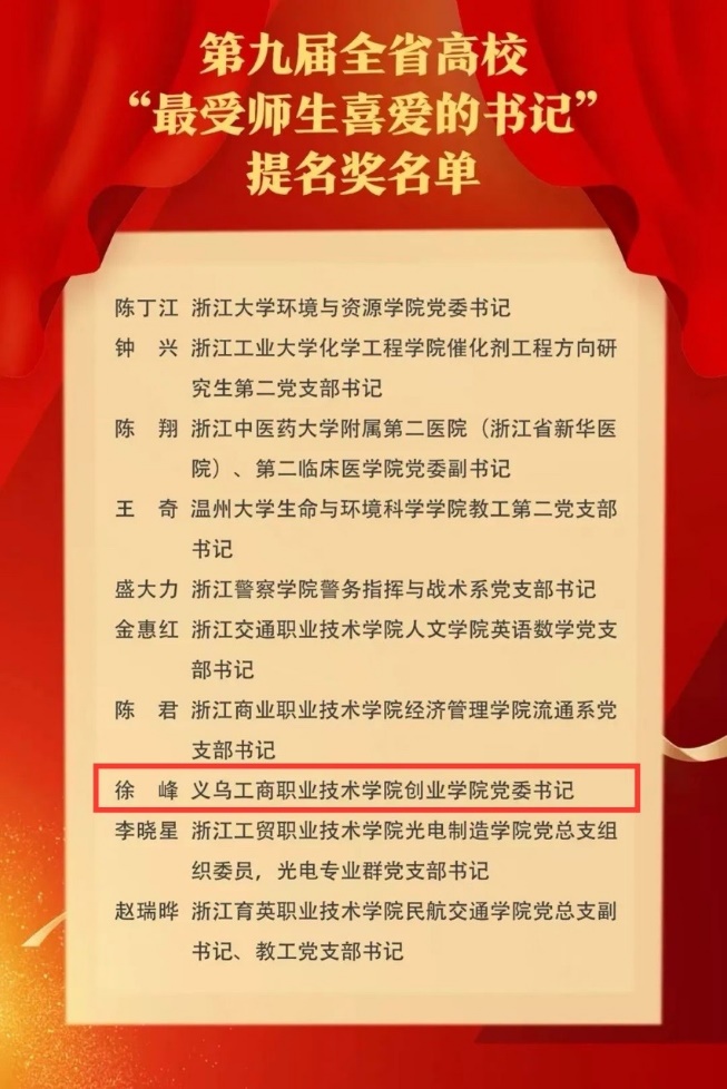 近日,浙江省普通高校党建研究专业委员会、浙江省教育宣传中心公布了第九届全省高校“最受师生喜爱的书记”遴选名单,学校创业学院党委书记徐峰同志成功入选第九届全省高校“最受师生喜爱的书记”提名奖。