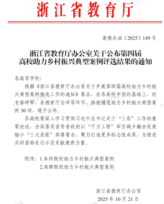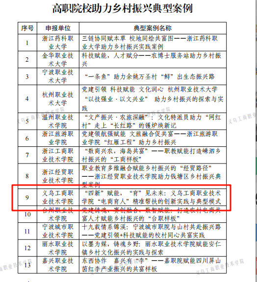 近日,10月21日,浙江省教育厅公布了《第四届高校助力乡村振兴典型案例》评选结果,通过高校自主申报及互评、专家评审、省教育厅会评等环节,择优遴出助力乡村振兴典型案例30项(本科院校15项、高职院校15项)。我校报送的《“四新”赋能,“育”见未来:义乌工商职业技术学院“电商育人”精准帮扶的创新实践与典型模式》案例成功入选。